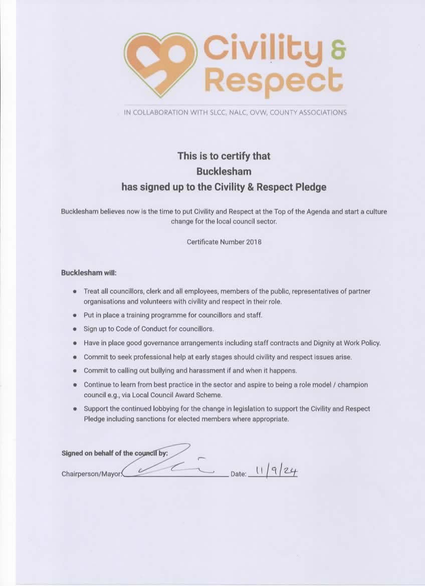 All Bucklesham Parish Councillors have signed up to the Code Of Conduct and the Civility and Respect Pledge.